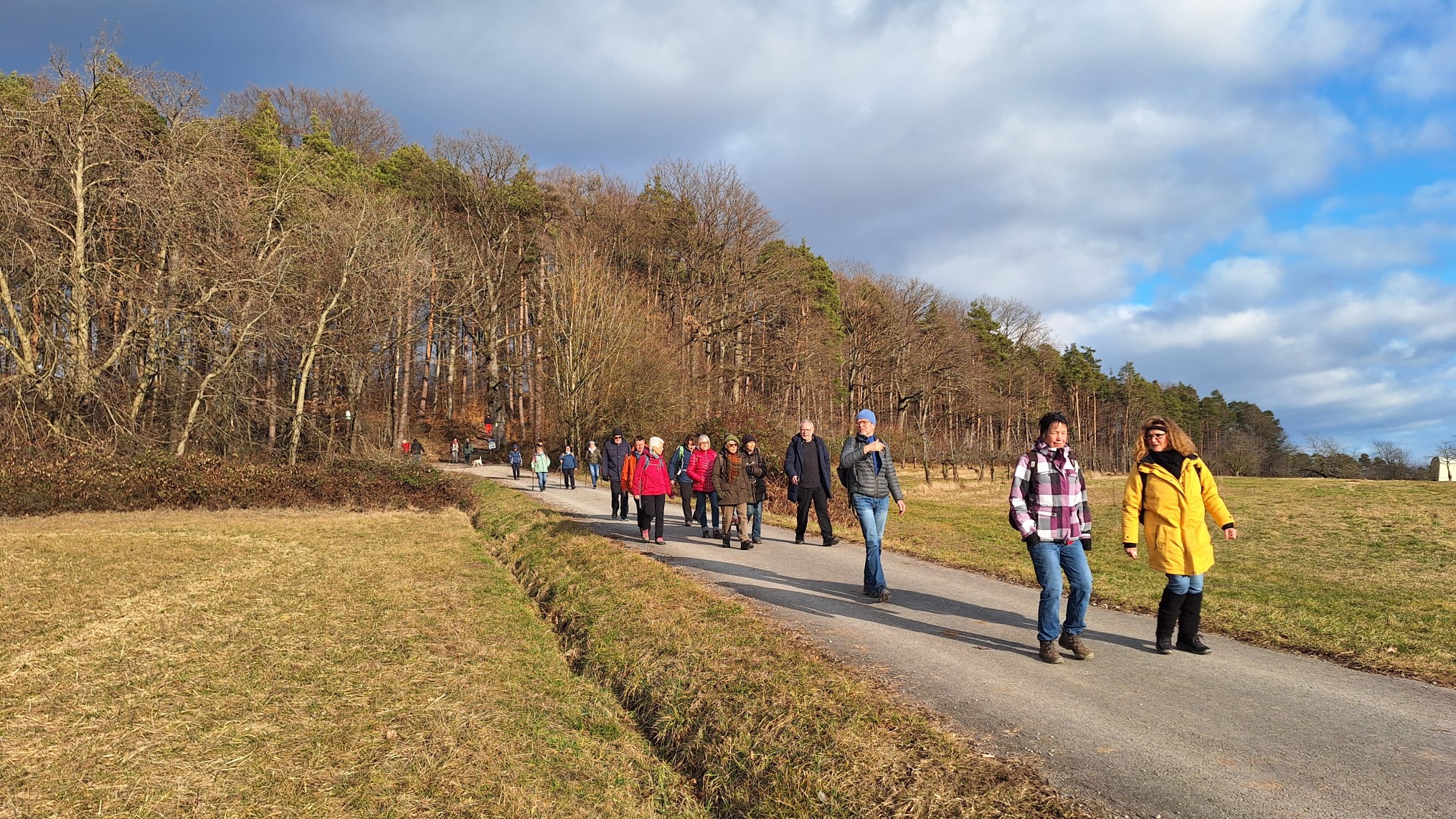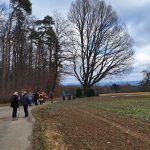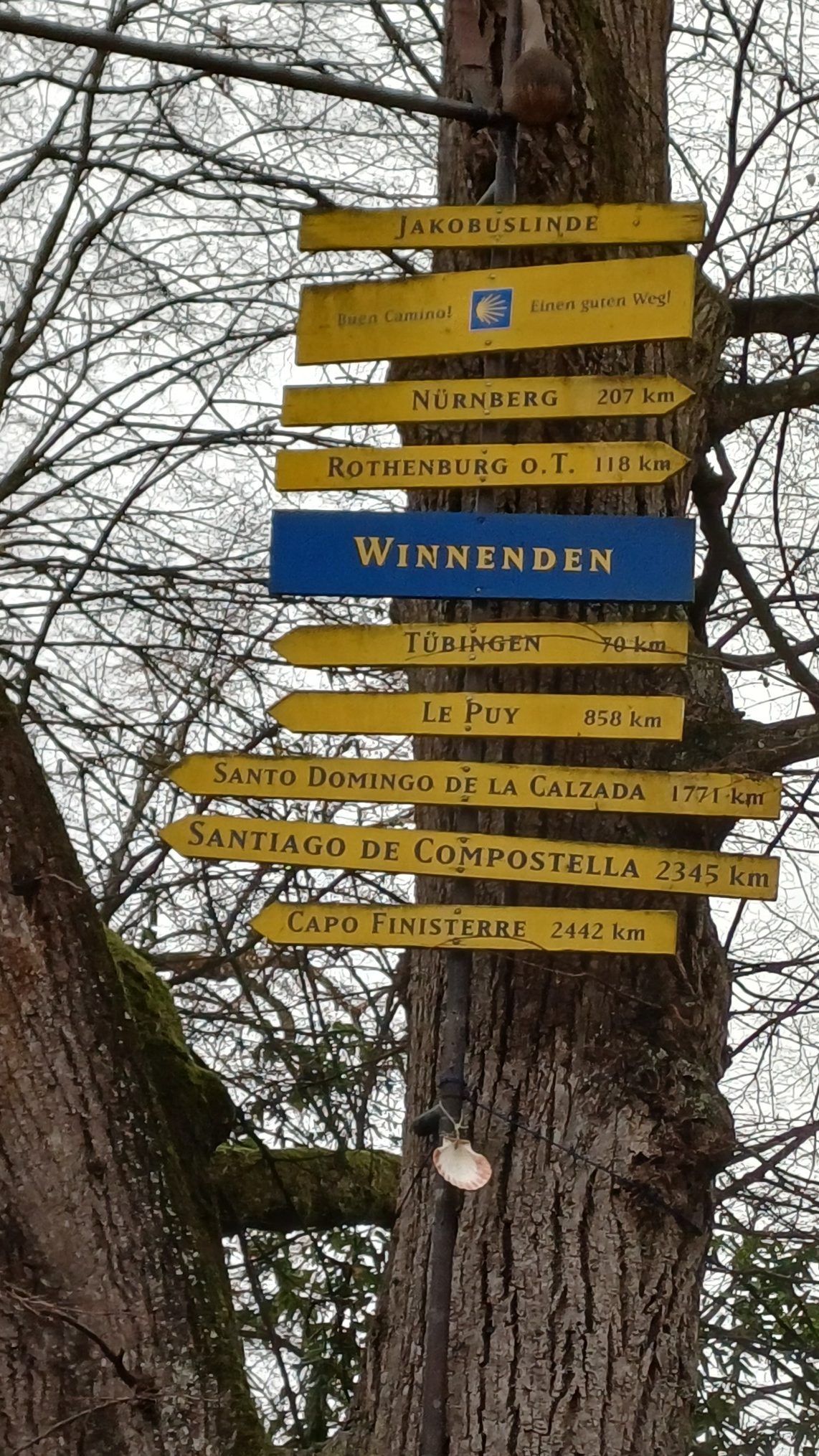 Dem Jakobswegzeichen nach kamen wir am Winnender Schloss und der Schlosskirche vorbei, die leider in den Wintermonaten nicht geöffnet ist. Bald erreichten wir den Zipfelbach, dem wir durch das Wiesental folgten. Der Nebel lichtete sich immer mehr und bald verhießen blaue Wolkenlücken doch noch einen sonnigen Tag. Der erste Anstieg führte uns in den Wald auf einen abenteuerlichen Pfad. Ohne Probleme kamen alle oben am Schotterweg an, der uns dann immer weiter in die Höhe führte. Beim Rastplatz Kreuzeiche genossen wir eine Vesperpause bevor es dann weiter bis zur Buocher Lichtung auf 519 m ging und uns die Sonne empfing. Früher ein Luftkurort zog Buoch auch viele Künstler und Schriftsteller an.