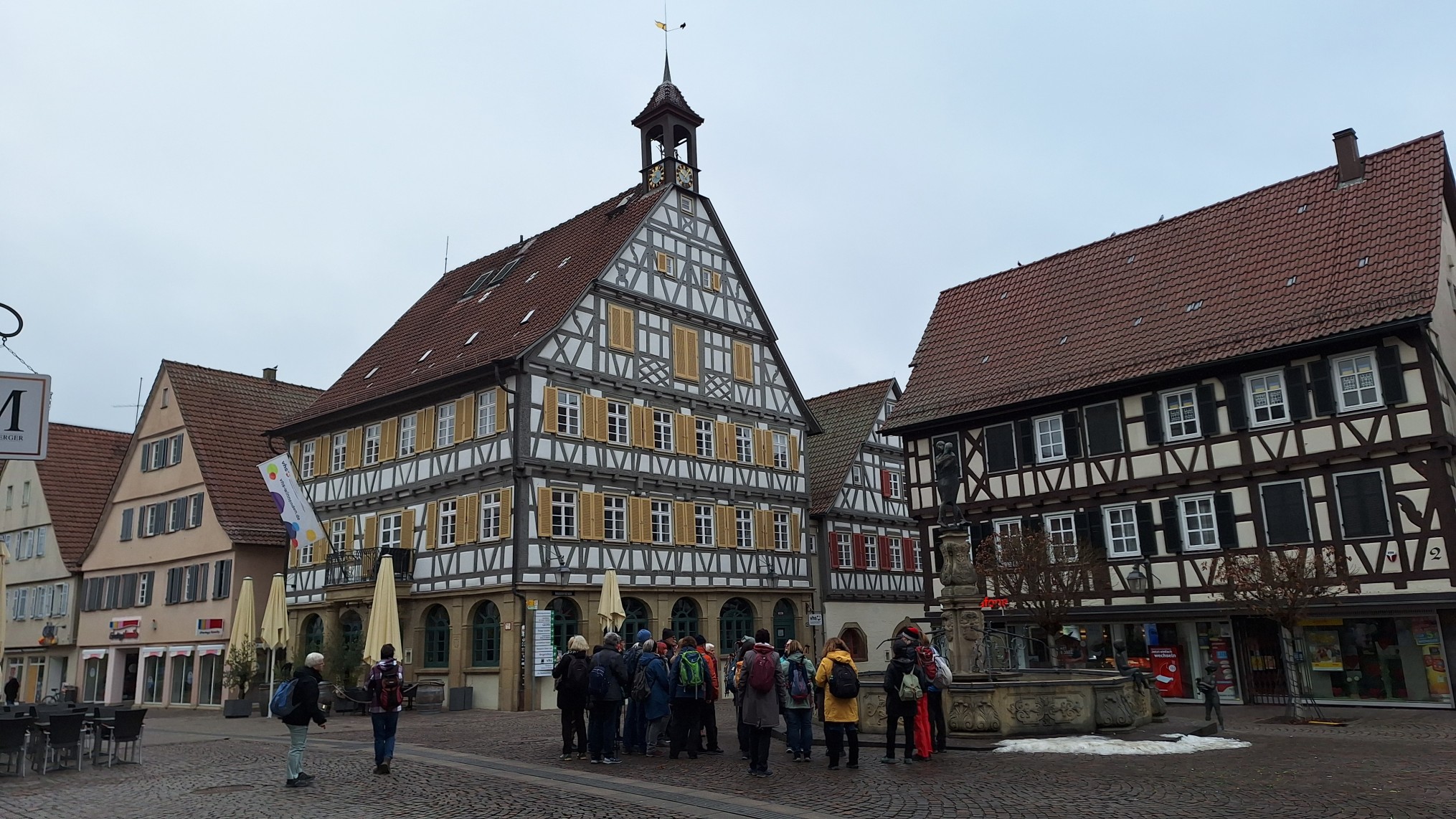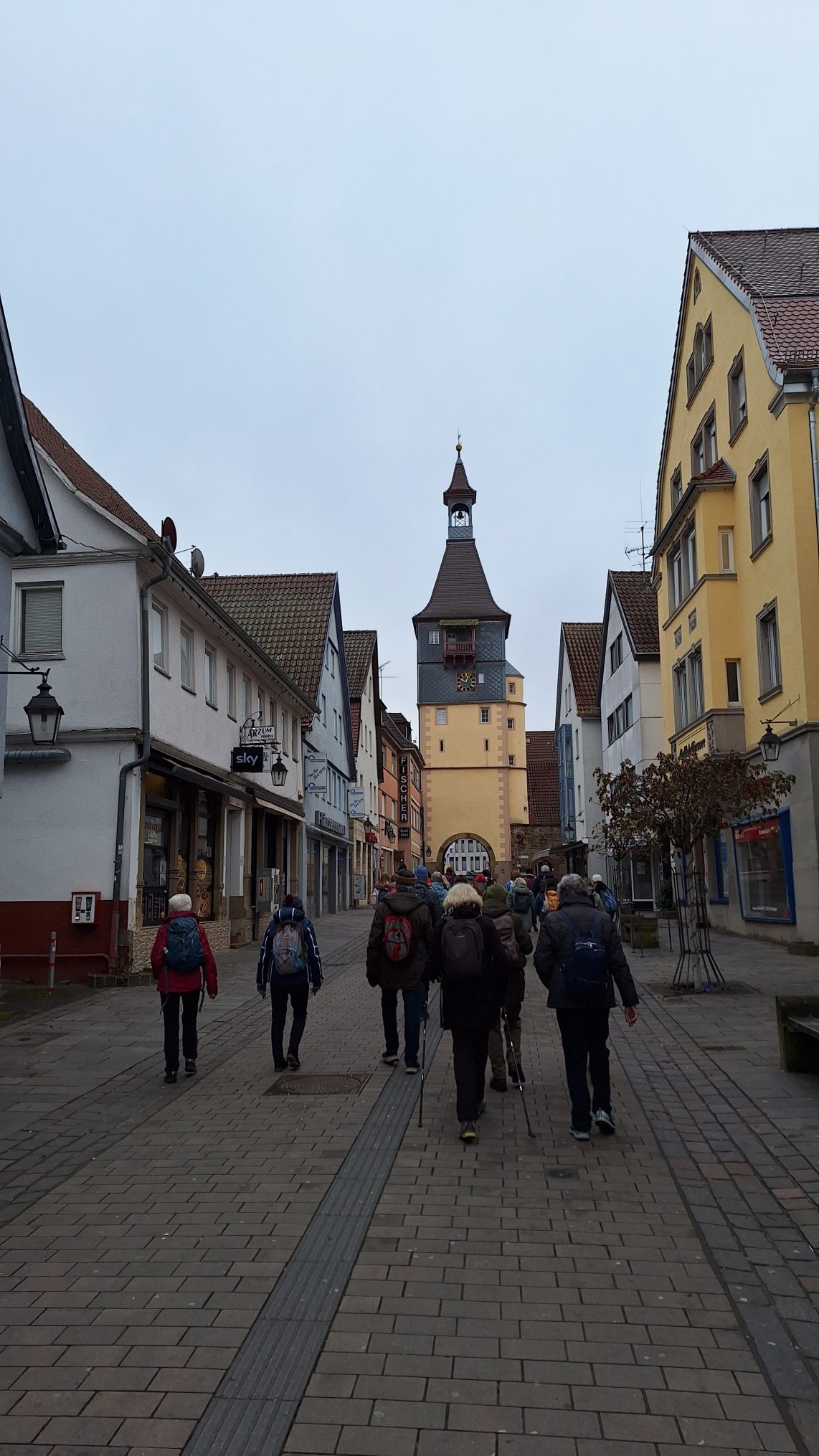 Mit dichtem Nebel begann unser Wandertag in Winnenden. Schon am Bahnhof erfuhren wir manch neues über die Stadt, die etliche Mitwanderer noch nie besucht hatten. Die Sportgeräte der Firma BENZ und Putzhilfen der Firma Kärcher kennen alle. Auch die Paulinenpflege und das Psychiatrische Krankenhaus sind bekannt.
